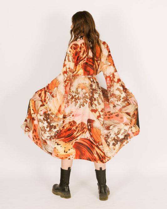 Maxi silk kimono, orange butterflies, long sleeve